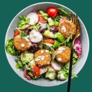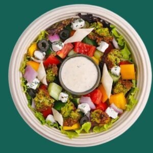 Chickpea falafel, olives, feta, cucumbers, and greens with a classic Greek dressing